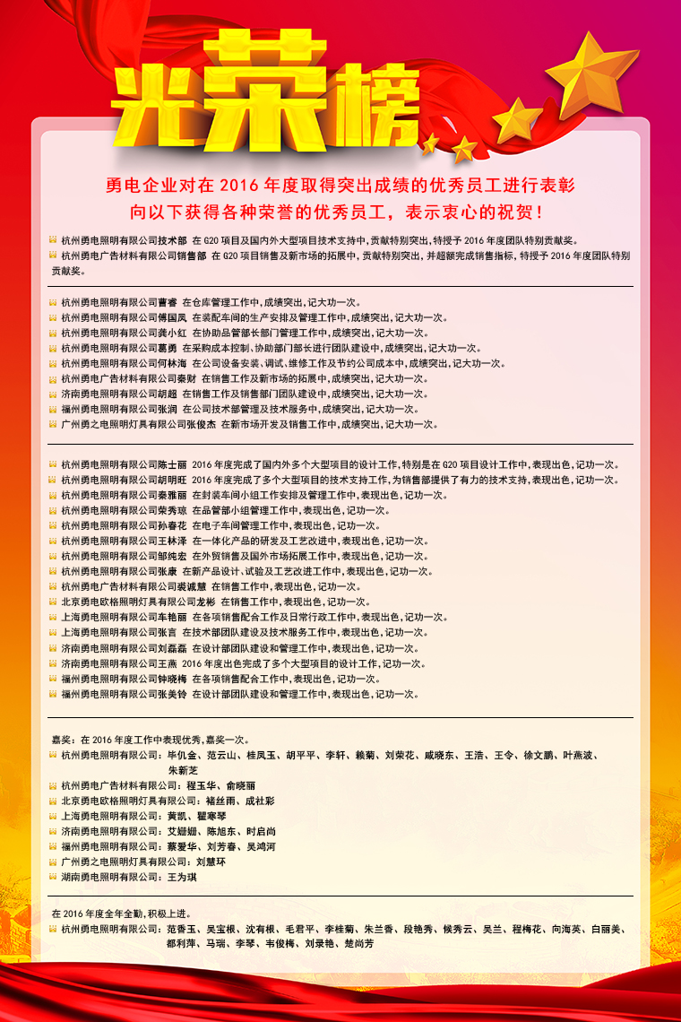 轉(zhuǎn)瞬之間,2016年已成昨天。在過去的一年里,勇電照明的團(tuán)隊(duì)涌現(xiàn)出眾多優(yōu)秀的員工,他們在平凡的崗位上創(chuàng)造了不平凡的業(yè)績?,F(xiàn)將勇電照明2016年度優(yōu)秀員工榮譽(yù)榜公布如下: