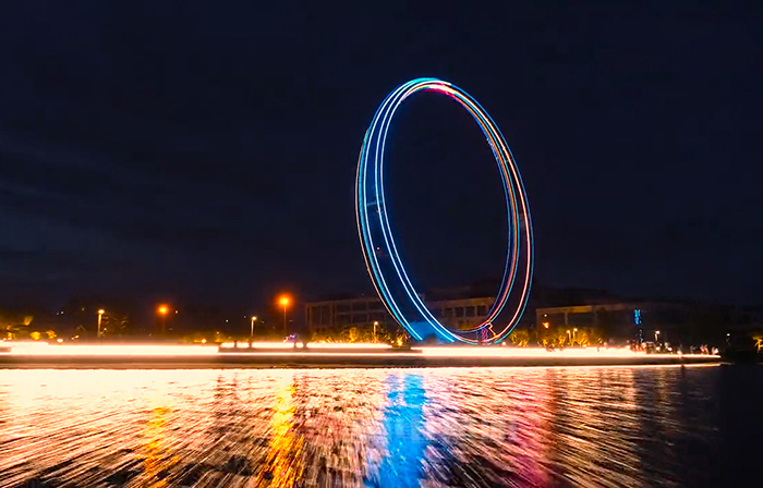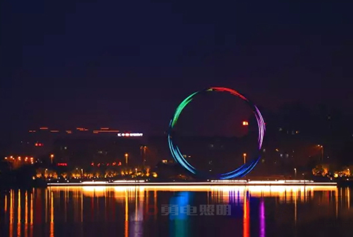 櫻花湖之戀是一座環(huán)形雕塑,坐落于威海櫻花湖體育公園。雕塑內(nèi)部凹槽上,安裝12條由勇電定制二次封裝70線條燈組成的光帶,光帶沿著環(huán)形輪廓鋪設,夜間亮燈后將雕塑變身為一個巨大的色彩斑斕的變色環(huán)。