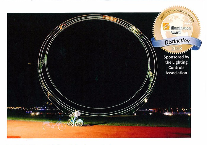 現(xiàn)場頒發(fā)獎項時介紹到:櫻花湖之戀項目雕塑燈光由自行車體感互動控制系統(tǒng)控制,通過騎動自行車可以控制燈光的變化形式以及變化速度。例如,自行車騎得越快,燈光變化就越快,有10秒騎行,就有10種相應形式的變化,當騎手中某人騎得較快時,燈光變化就主要由他帶動著。