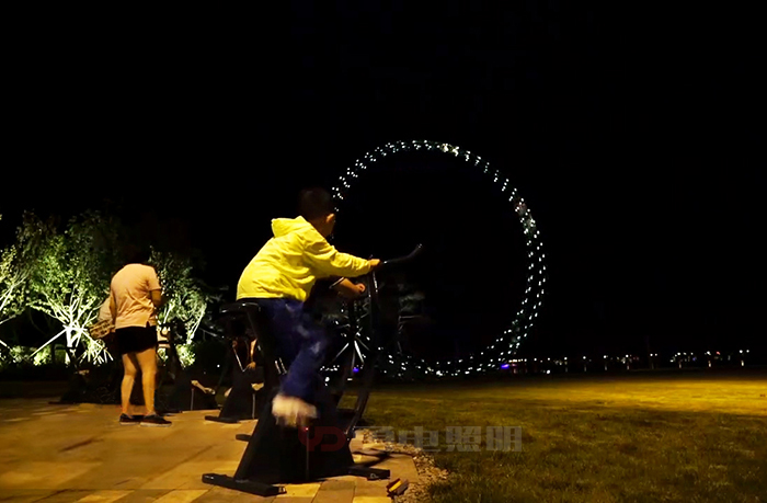 雕塑夜景燈光呈現(xiàn)上以騎單車這一運動為載體,打造人與燈光的互動。雕塑照明燈具內(nèi)置勇電體感互動控制系統(tǒng),并與單車進行相連,系統(tǒng)可以通過傳感器將踩踏的速率轉(zhuǎn)化為控制信號,來改變鑲嵌在雕塑上的燈光,燈光隨著騎車人車速的變化而變化,現(xiàn)場12輛單車可分為合作模式、單人競技、分組競技三種互動方式。