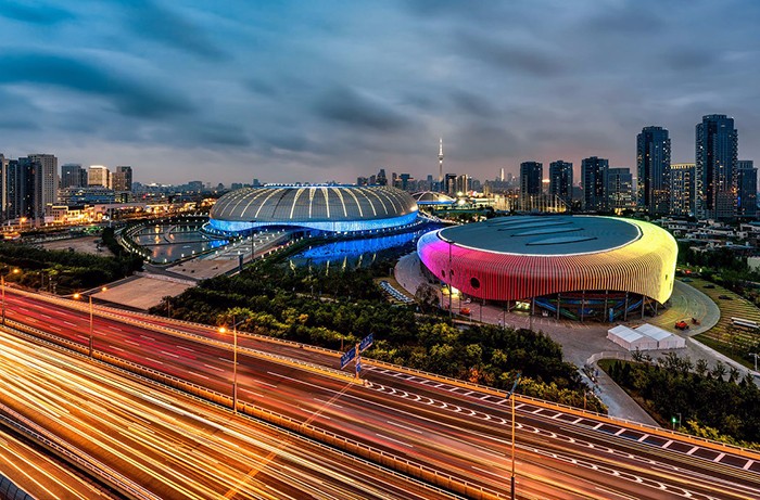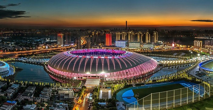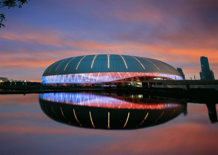 臨水而建、依水而起,占地面積8萬(wàn)平方米,觀眾座席6萬(wàn)個(gè),建筑外形狀如水滴,能夠滿足國(guó)際足球、世界田徑比賽需求的水上體育館。