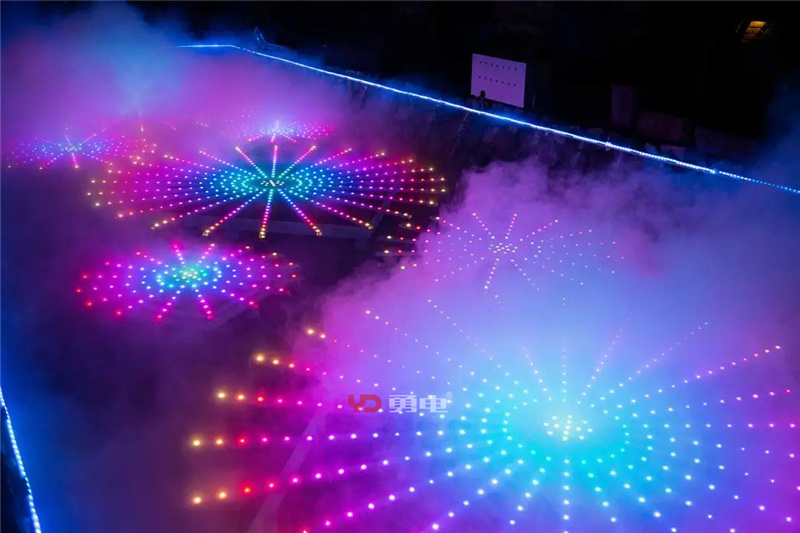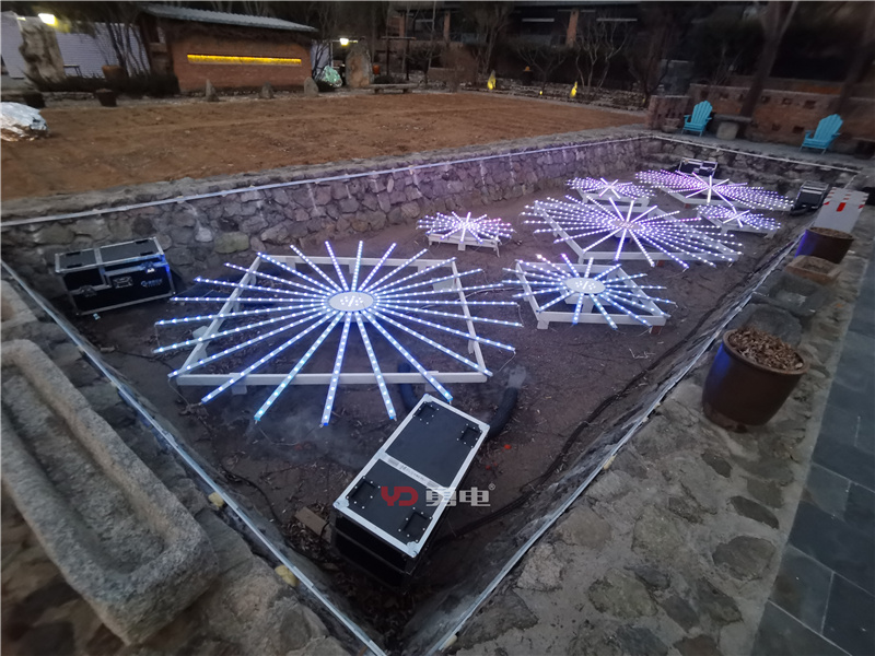 勇電Φ20點光源在水池底部組成了大小不等的7個圓形造型,IP68燈具護(hù)航“靈動”燈光藝術(shù)設(shè)置穩(wěn)定運行,水霧悠寥,光影交錯,長城腳下的小山村,因光影藝術(shù)而靈動。