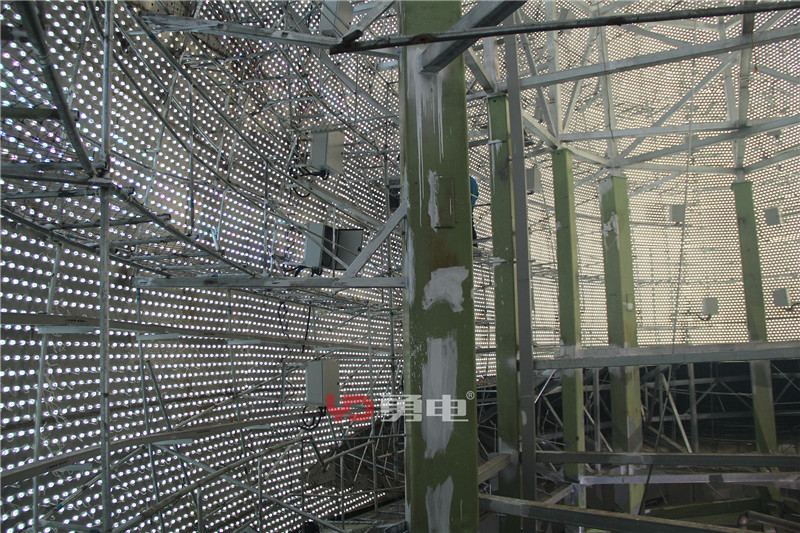 該作品主體為船形結(jié)構(gòu),鏤空部分采用定制鋼絲網(wǎng)屏,用掛鉤與船身固定。由于雕塑主體是動態(tài)活動的,會隨著表演展開和閉合,我們配置了更強的固定裝置以固定控制線及電源線,避免雕塑的擺動對燈具的正常運行造成影響。