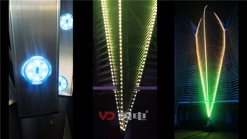燈具采用軌道方式安裝,沿建筑造型外部鋼結構進行“描邊”,充分突出荷花、柳葉的建筑風韻。為迎牛年春節(jié),該項目工期緊急,施工用時僅15天,在春節(jié)前(2月7日)就完成了燈具的全部安裝!