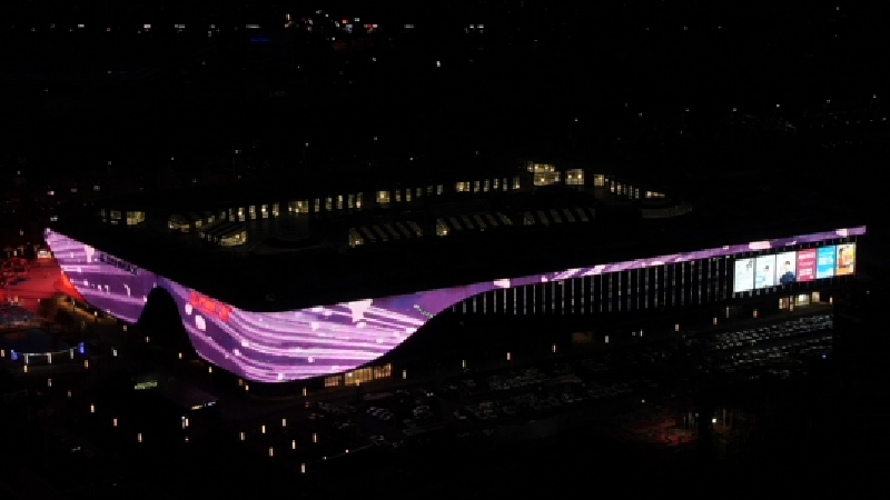 東西湖萬達廣場夜景照明以現(xiàn)代大氣為理念,結合立面漸變的網(wǎng)格肌理,采用勇電LED點光源運用于戶外景觀照明,打造了一塊面積達5500㎡的戶外媒體屏。