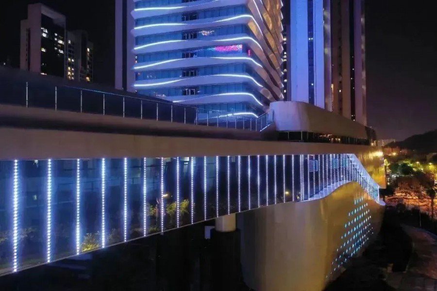 寧德華僑大廈建筑立面呈波浪狀,燈具沿著建筑立面細窄外沿進行細致勾勒,在確保夜晚”海浪波濤“的燈光效果符合城市文化底蘊、提升城市形象的同時不破壞建筑白天簡潔、律動的建筑風格。