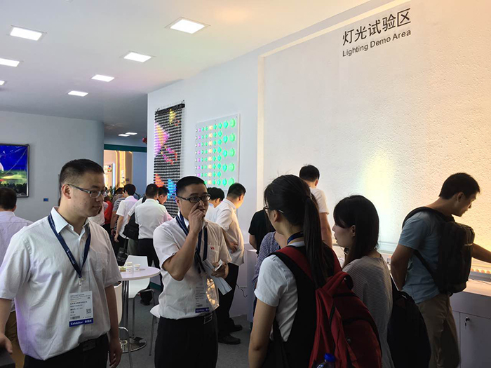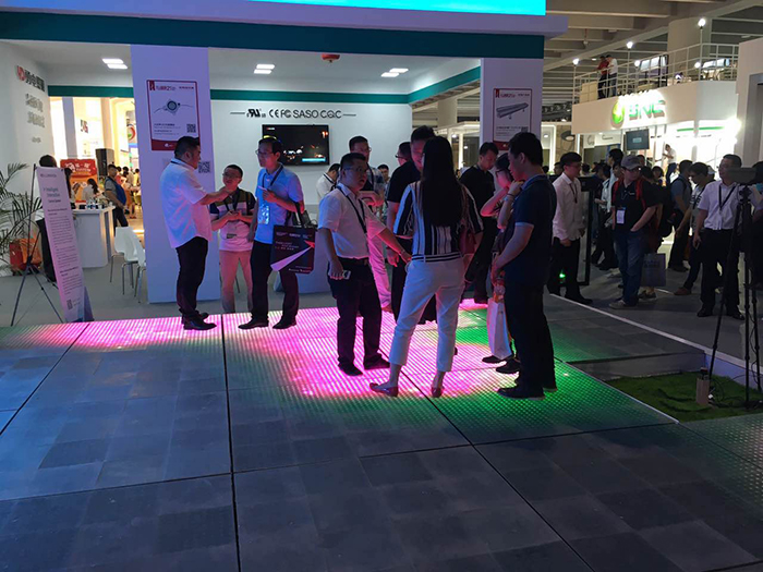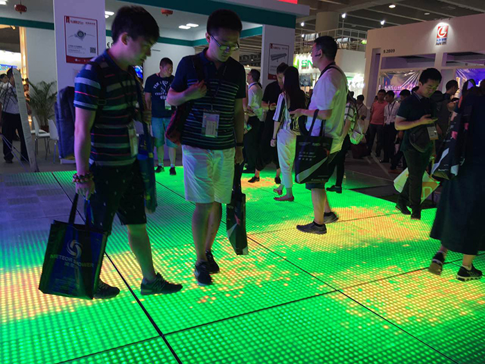 展會上,勇電照明此次推出的“智能化燈光互動控制”技術引起了很多新老客戶的關注,在智能燈光互動體驗區(qū),人們站在探測器前方,通過移動手掌來控制LED屏上動畫的顯示,還可以站在地磚屏上,通過人體的移動來帶動地面燈光的走勢,這種可單人可多人同時參與的新穎互動模式吸引了眾多觀眾前來體驗,使人們更近距離的感受到智能燈光所帶來的科技魅力,成為展會上一大亮點。