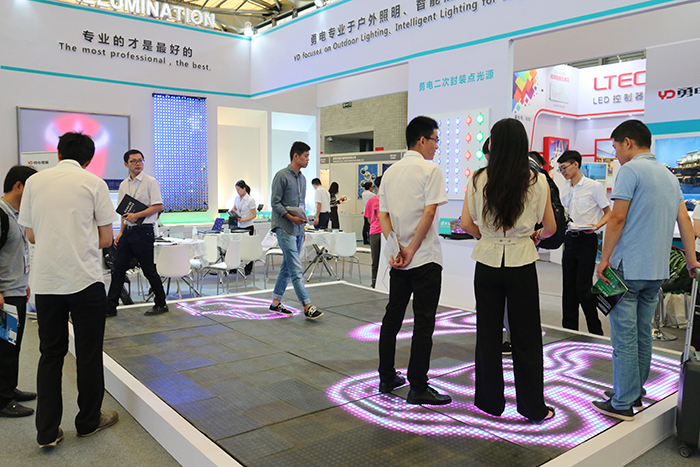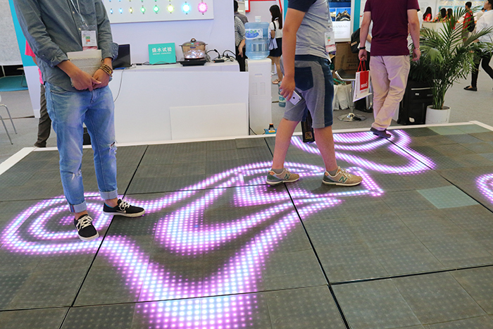 勇電照明展廳內(nèi),一塊大型的LED地磚顯示屏成為本屆展會(huì)上的焦點(diǎn)之一。該顯示屏采用勇電體感互動(dòng)控制系統(tǒng),可以實(shí)現(xiàn)人體與燈光的互動(dòng),并可實(shí)現(xiàn)多人互動(dòng)。當(dāng)人們站在地磚屏上,腳下屏幕上的動(dòng)畫效果會(huì)隨著雙腳移動(dòng),智能化互動(dòng)體驗(yàn)吸引著來(lái)往的參展客戶駐足停留,并紛紛給予由衷的贊嘆。